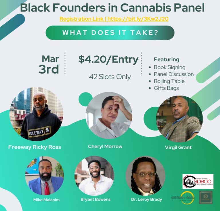 Greenish Events, in partnership with the County of San Diego Black Chamber of Commerce and Greenish Vibes, presents the Black Founders in Cannabis Panel. This panel will bring together a group of influential black business owners and advocates in the cannabis industry to discuss their experiences and explore the challenges and opportunities facing black entrepreneurs in the industry. The panelists include Freeway Ricky Ross, Virgil Grant, Mike Malcolm, and Cheryl Morrow. The event will take place on March 3, 2023, featuring a cocktail hour and rolling session, a panel discussion, and a Q&A session.