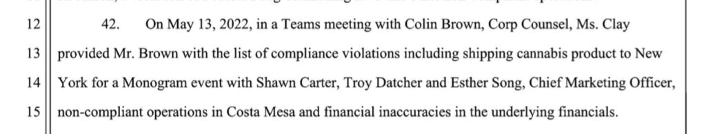 The lawsuit also alleges that TPCO executives shipped cannabis products across state lines “to New York for a Monogram event with Shawn Carter.” Moving cannabis across state lines is a felony at the federal level, and California’s cannabis regulations strictly prohibit shipping legal cannabis out of state.