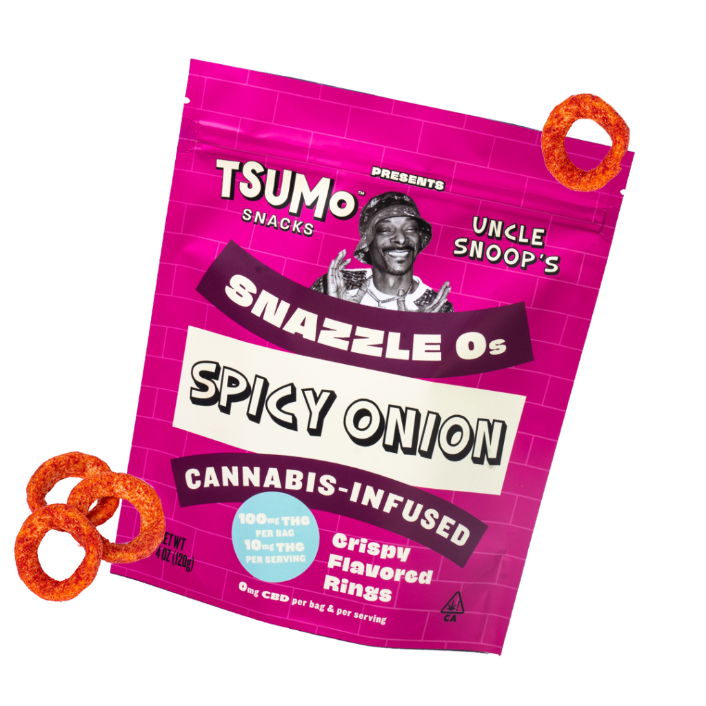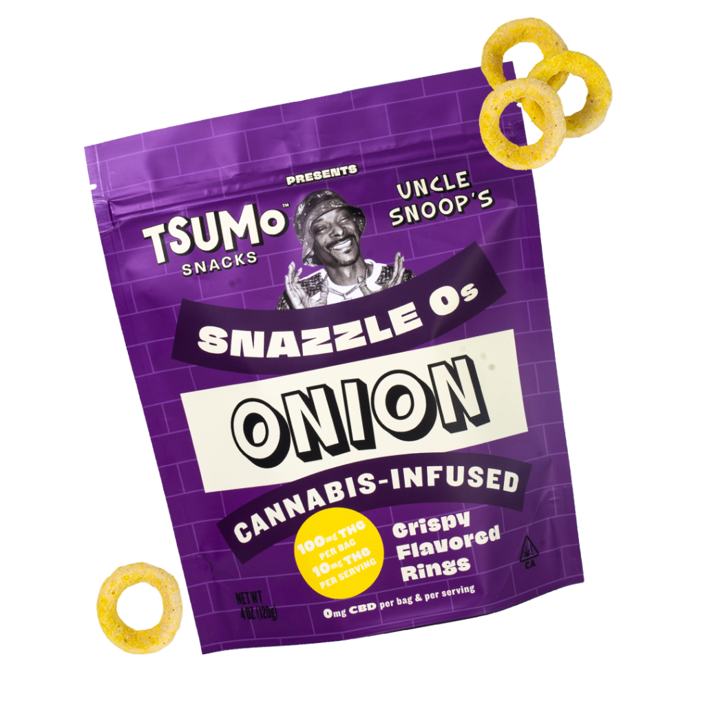 The Snazzle Os come in two flavors, Onion and Spicy Onion. While sweet cannabis edibles from brownies to chocolates to gummies are the most well-known foods in the market, TSUMo’s market niche highlights savory and salty snacks, some of Snoop’s favorites.