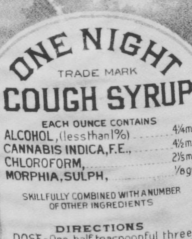 In the late 1800s, a cough drop salesman sold a cough syrup called “One Night Cough Syrup” that contained alcohol, cannabis, chloroform, and morphine. It was available over the counter and promised to eliminate a cough in one night so people could sleep.